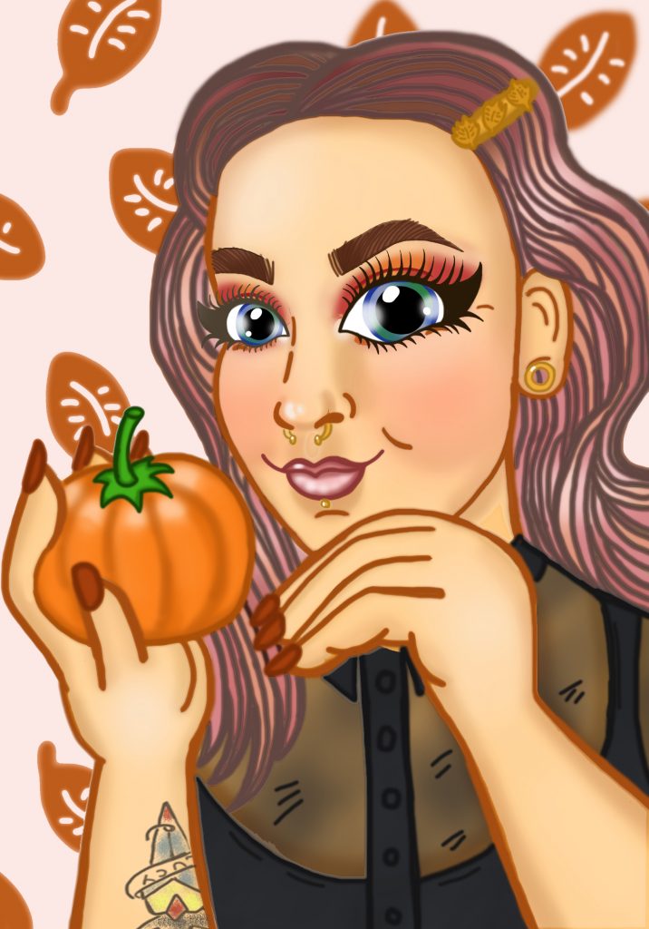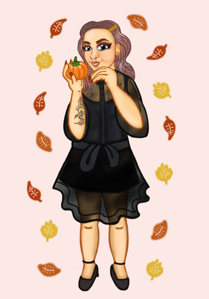 I contacted her and gave her a gist of my style and vibe. The few requests I had were to be holding a pumpkin and to give me pink hair with brownish roots as I was soon going to be dying my hair. I sent her some images of myself and a few days later she sent me the first draft. I fell in love! She had done the dress I was in beautifully.
