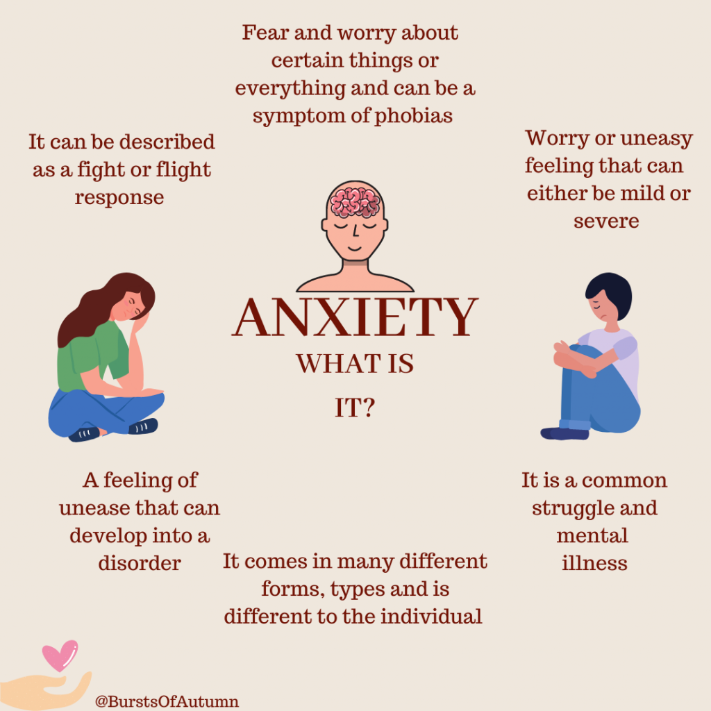 So focusing on the big question, ‘What is anxiety?’ – As seen below in the image (For visually impaired, the sentence following explains the writing on the image), it explains that anxiety is a fear and worry about certain things or everything and can be a symptom of phobias. It can be described as a fight or flight response and can cause worry or an uneasy feeling that can be either mild or severe. It is generally a feeling of unease that can develop into a disorder. Anxiety is a common struggle and mental illness and comes in many different forms, types and is different to the individual.