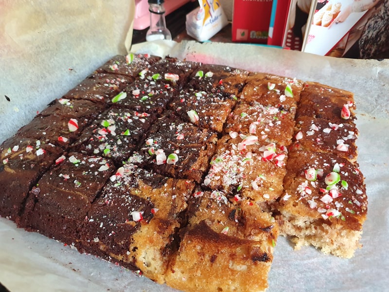 Homemade Mint Chocolate and vanilla mint cake topped with crushed candy cane and golden syrup