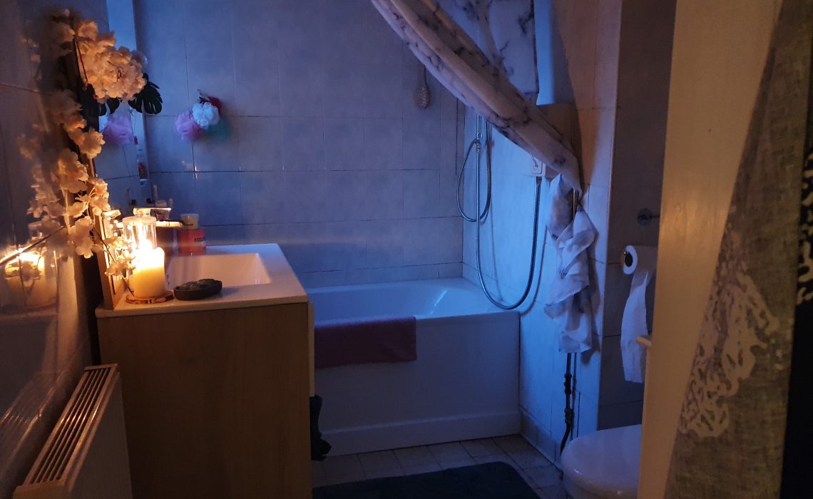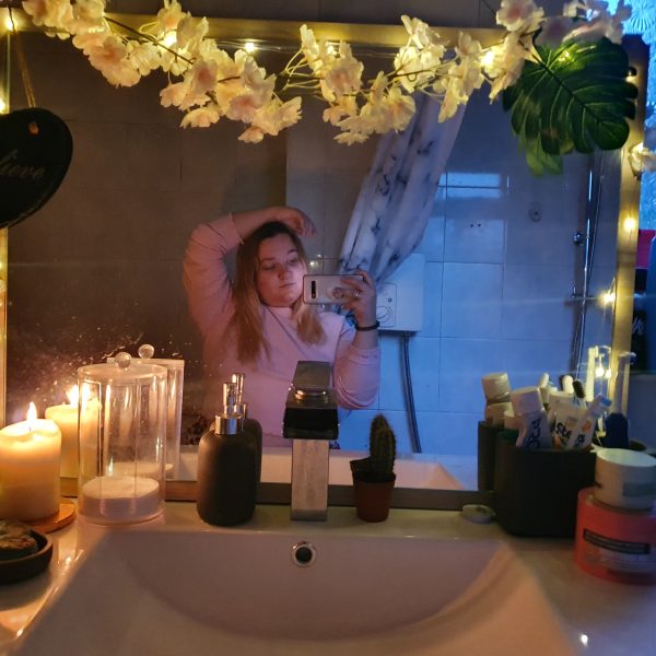 I have added some faux cherry blossom garlands, fairy lights intertwined and some candles to the basin unit and mirror. It adds so much life and energy to the bathroom and really helps bring peace and calm to bath times. I have also added some lovely matching accessories with soap dishes and hand wash bottle as well as the light switch, bin and toilet brush. It’s all uniform and brings the room together