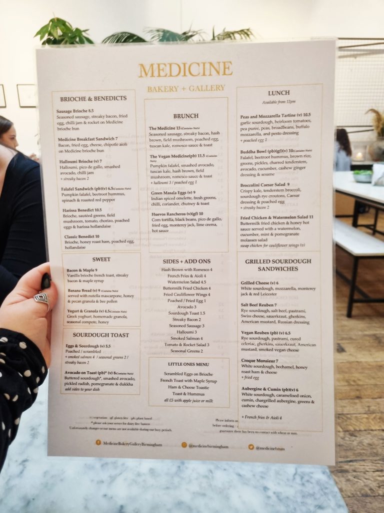What a beautiful place to go for brunch? Medicine is a lovely bakery, gallery and cafe and one I am so glad I now know about thanks to a lovely friend of mine. My friend Stacey invited my friend and I for brunch last year some time and mentioned a place called ‘Medicine’ which sounded very unique. I had no idea it was in the centre of brum, tucked away in one of the buildings on New street. What a treat! The atmosphere was lovely, refreshing and open; Full of plants, beautiful gallery artwork on the walls and lovely staff who were very helpful, cheerful and gave great service.