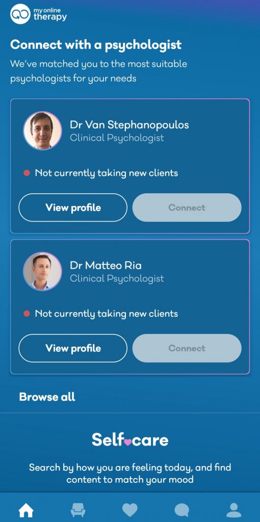 As you can see, the home page starts with any psychologists you have been matched to which allows you to have therapy sessions. My matched professionals are not available sadly and so I am unsure how this function works and whether there are any additional in app purchases needed for these private sessions. I would however imagine so. The chair icon next to the homepage is for any therapy sessions you have.