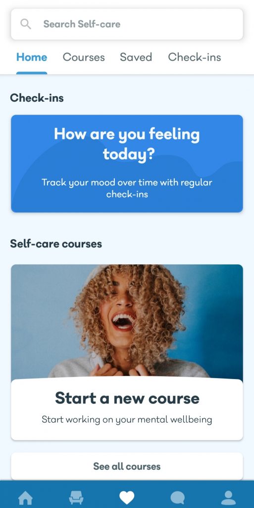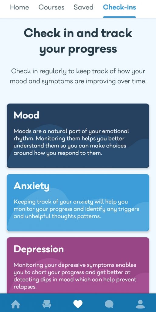 As you can see below, the heart icon in the footer menu takes you to your courses on self care and your check ins. You can check in with yourself covering Anxiety, Depression and Mood overall and the app tracks these check ins on a chart to see how your mood dips and rises over a period of time.