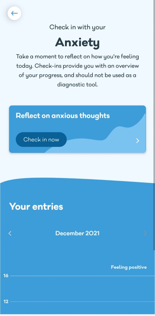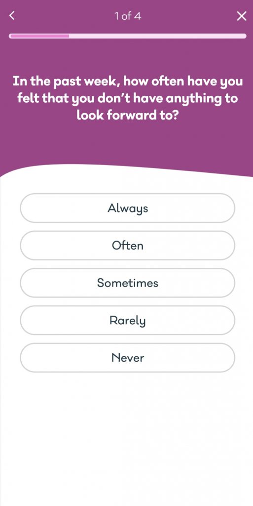 Below are the different screenshots I took from the app when using the ‘Check-in’ function. So below is what the check ins look like. They come with around 4/5 questions about either Anxiety, Mood or Depression and then gives you an outcome of how you are feeling afterwards.