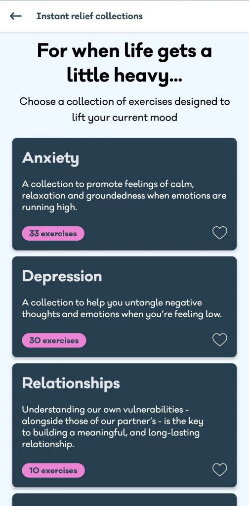 On top of learning, they have immediate relief functions for when you are in crisis or are in need of immediate help with your thoughts and feelings as well as therapists you can book.