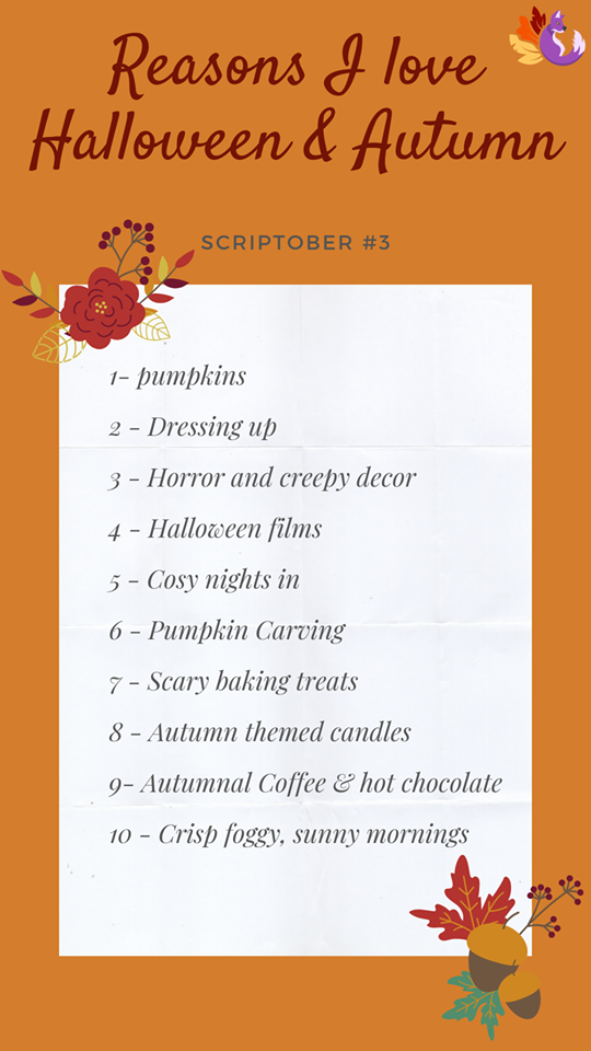 Scriptober Day #3 | Why I love Halloween and Autumn? 3 October 2019 Be first to comment Pin It Stay tuned for more #Scriptober content! AutumnbakingBloggercandlesChallengecoffeecosycrispDecordressing upFallfilmsfoggyHalloweenhorrorhot chocolateinteriormorningspumpkinsscaryScriptoberspookysunny Share You may also like View Post My daily routine with children during school holidays | Parenting series View Post The Mental Maul: How Rugby Tackles Mental Health | Collaborative post View Post Favourite Winter beverages | Blogmas 18! View Post Halloween Party Guide! View Post Let’s party! Or maybe not… | Old post – repost View Post How to sideline wedding stress | Lifestyle series *AD View Post What I do on a rainy day | #BlogtoberWithBoa Day 12 View Post Houdinis Escape rooms – Star City Birmingham | Honest Review No Comments Leave a Comment Δ This site uses Akismet to reduce spam. Learn how your comment data is processed. Previous Post Scriptober Day #2 |… In Life Scriptober Day #2 | Fall/ Autumn Bucket List! View Post Next Post Scriptober Day #4 | Autumn… In Life Scriptober Day #4 | Autumn Accessories! View Post