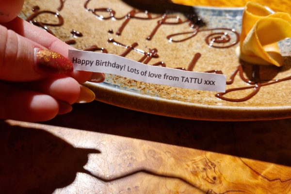 At the end of my birthday meal, they suprised me with a fortune cookie and chocolate writing saying ‘Happy birthday’. Inside the fortune cooking was this lovely little message reading “Happy birthday! Lots of love from TATTU xxx” which was just lovely. A few bits of feedback would be to make the candy rice sweeter and to have more vegan options on the menu.
