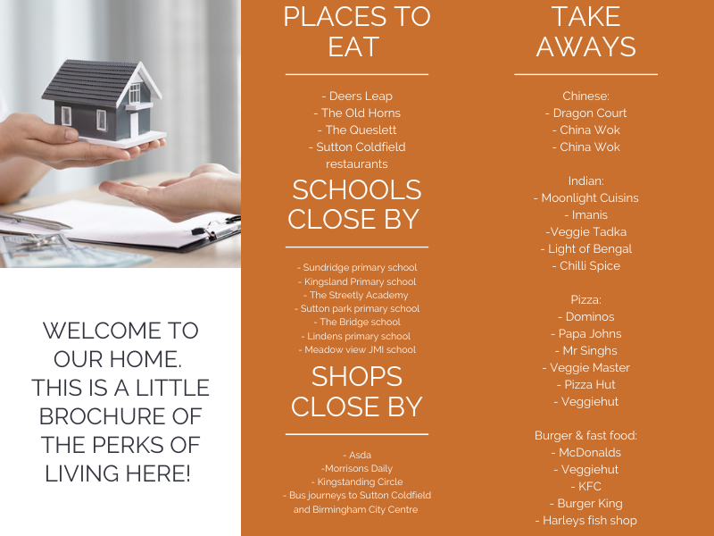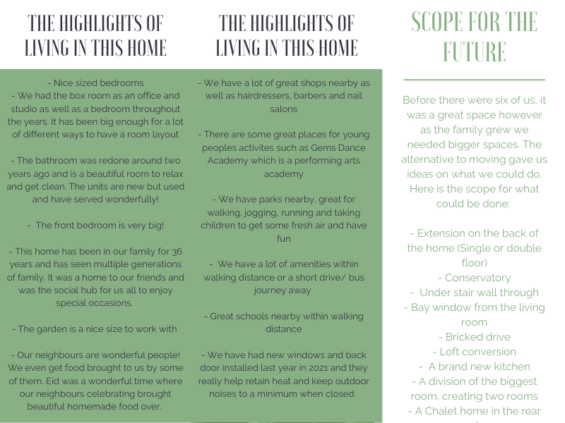 I made some ‘brochures’ about the home and area. I included ‘Highlights of living in this home’, ‘Scope for the future’ and various positive places nearby. It made the visit more charming and memorable and also created that home atmosphere rather than just a house.
