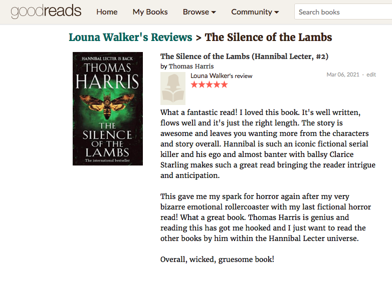Thomas Harris does not hold back on the details which I love. There is gore, anticipation and I genuinely felt nervous with butterflies (or moths *wink*) in my stomach during the last few chapters. It’s written really well within quite a short length in my opinion and there is enough detail to make the story awesome whilst not going overboard. It flows well and the sections are well sequenced.