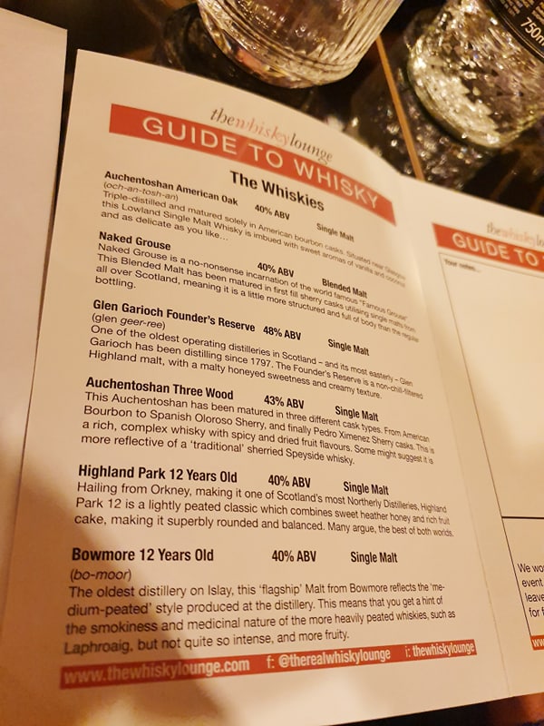 Above is the leaflet we had above our whiskey glasses when we arrived at the Whisky lounge. It’s a little guide to the whisky we will be tasting! It’s fab. It’s super informative and is great to have during our tasting experience.